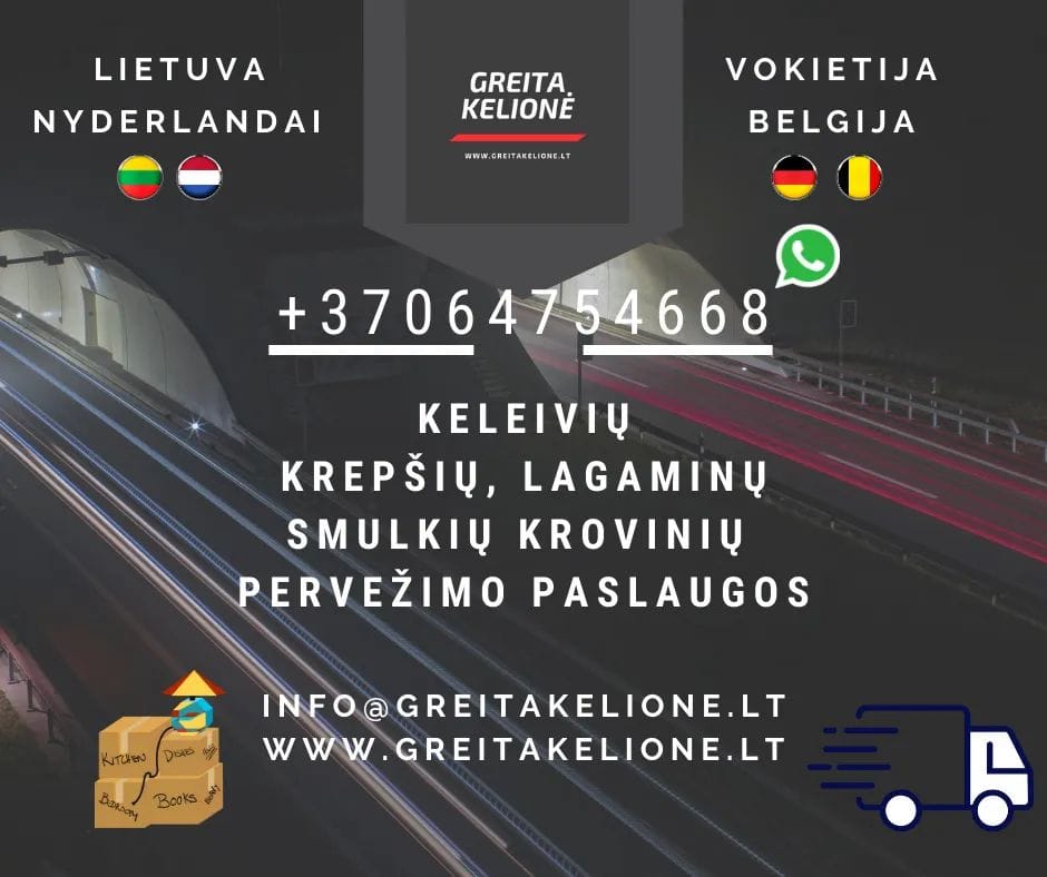 Dėmesio! Profesionalūs jų vairuotojai laukia Jūsų! Kiekvieną savaitę vežame keleivius ir siuntas į Angliją. Vežame didelius krovinius ir užsakymus į Angliją su atskiru automobiliu. Užtikriname patogią ir saugią kelionę. Mikroautobusuose įrengta nauja audiosistema, kondicionieriai bei talpus bagažo skyrius, o keleiviai apdraudžiami. Važiuojame iš Klaipėdos per Kauną ir Marijampolę užsukdami į aplinkinius miestus ir miestelius, tokius […]